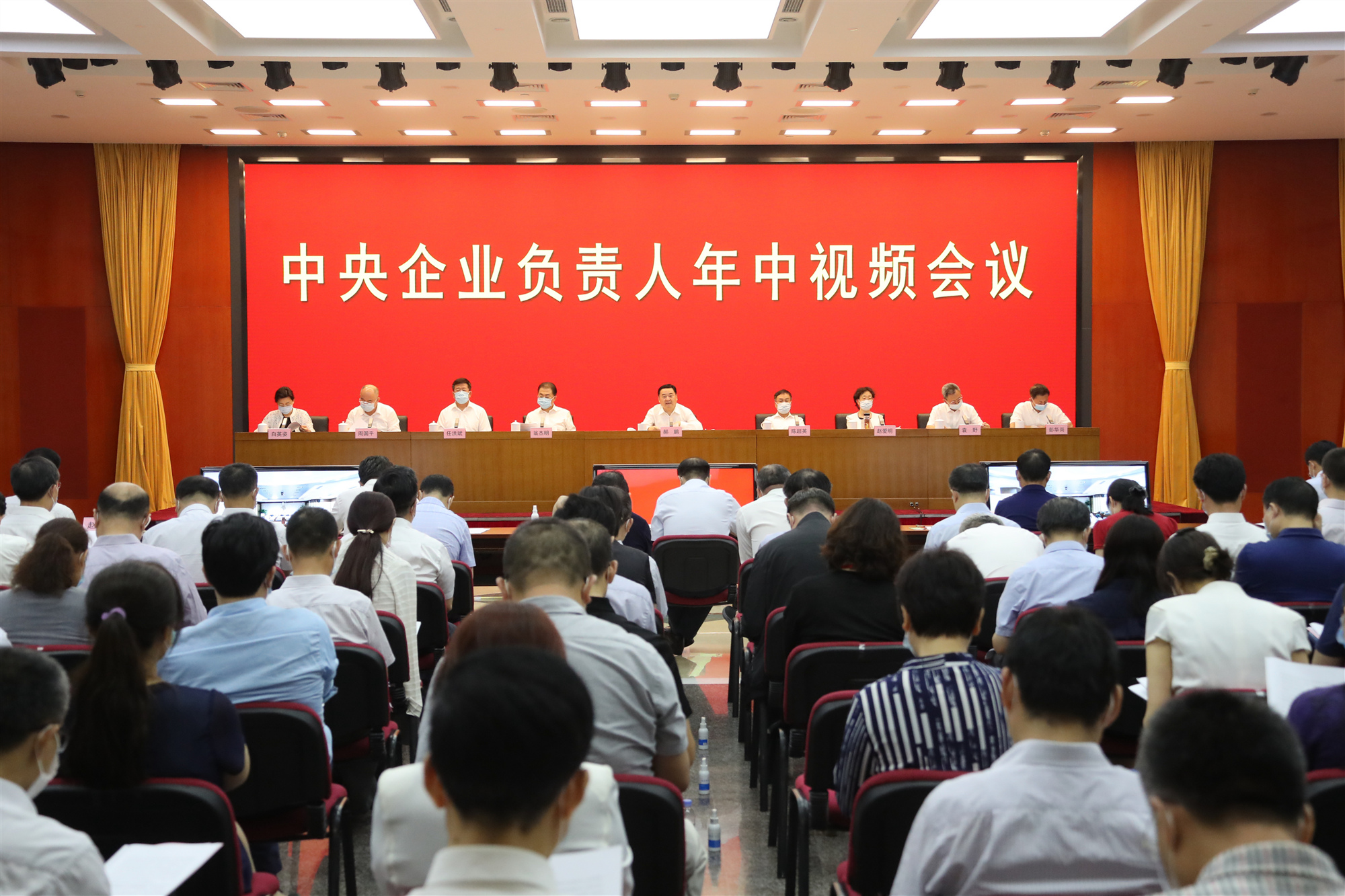 会议指出,今年以来,面对突如其来的新冠肺炎疫情,在以习近平同志为核心的党中央坚强领导下,国资委和中央企业坚决贯彻习近平总书记关于统筹推进疫情防控和经济社会发展工作的重要讲话精神,贯彻落实党中央、国务院决策部署,统筹推进疫情防控和企业经营发展工作,在疫情防控斗争中冲锋在前、勇挑重担,全面动员部署,迅速形成强大合力,勇扛急难任务,全力驰援抗疫前线,强化基础保障,提供坚强抗疫支撑,抓早抓细抓实,强化境外单位疫情防控,充分发挥了大国重器顶梁柱和国家队作用;在推动经济社会发展中迎难而上、奋力拼搏,率先复工复产,带动各类市场主体共同发展,生产经营逐月好转,经济效益企稳回升,加大科技创新力度,重大项目稳步推进,企业改革不断深化,有效激发发展活力,充分发挥了国民经济压舱石和主力军作用,以实际行动在这场大战大考中践行初心使命,交出了合格答卷。 会议强调,面对疫情重大冲击、国际国内环境重大变化,习近平总书记统筹“两个大局”,对关系党和国家事业的重大问题发表了一系列重要讲话,作出了一系列重要指示,为做好各项工作进一步指明了方向,提供了根本遵循,对于更好应对当前严峻挑战、奋力完成全年目标任务具有重要指导意义,要深入学习领会,坚决贯彻落实。要科学分析当前形势、把握发展大势,坚定发展信心,积极识变应变求变;深刻认识发展壮大国有经济的重要意义,强化使命担当,坚定不移做强做优做大国有企业;实施扩大内需战略、构建新发展格局,把满足国内需求作为发展的出发点和落脚点,积极融入以国内大循环为主体、国内国际双循环相互促进的新发展格局;深化国有企业改革,抓重点、补短板、强弱项,主动积势蓄势谋势,不断增强国有经济竞争力、创新力、控制力、影响力、抗风险能力;着力优化和稳定产业链供应链,突出科技创新,全力固链补链强链;防范化解重大风险,强化底线思维,努力避险化险除险。要狠抓落实、务求实效,努力在危机中育新机、于变局中开新局,更好服务发展大局。 会议要求,今年下半年是决战脱贫攻坚、决胜全面小康收官倒计时的关键阶段,做好国资央企工作责任重大,要凝心聚力攻坚克难,奋力实现全年目标任务。突出抓好提质增效稳增长,咬紧全年目标任务,全力拓展增长空间,强化管理挖潜增效,全力以赴抓好企业经营发展工作。突出抓好企业改革落实落地,以实施国企改革三年行动方案为重要抓手,狠抓责任落实、重点举措、典型示范,切实提升改革综合成效。突出抓好关键核心技术攻关,集聚各类优秀人才,切实加强协同创新,集中抓好重点任务攻关,努力维护我国产业链供应链安全稳定。突出抓好国有资本布局优化和结构调整,以编制“十四五”规划为重要抓手,强化规划战略引领作用,突出主业实业优化升级,积极推动重组整合,高质量推进“一带一路”建设,进一步提升国有资本整体功能和配置效率。突出抓好重大风险防范化解,以健全防控机制为重要抓手,切实防范化解违规投资经营和管理风险,高度重视安全环保稳定风险,坚决守住不发生重大风险的底线。突出抓好企业党的建设,以“中央企业党建巩固深化年”为重要抓手,切实加强党的政治建设,推动企业党建与业务工作深度融合,扎实做好宣传舆论工作,以高质量党建引领高质量发展。突出抓好疫情常态化防控,抓实抓细境内和境外单位疫情防控,全力服务抗疫工作需要。要进一步加大脱贫攻坚工作力度,坚决克服疫情和灾害影响,增强工作针对性、提高扶贫实效性。当前,要充分发挥专业技术优势,有力支援地方防汛抢险工作,为保障人民生命财产安全、恢复正常生产生活秩序贡献力量。 国资委总会计师、副秘书长,驻委纪检监察组,国资委各厅局、直属事业单位负责同志在主会场,各中央企业领导班子成员、外部董事在企业分会场参加会议。